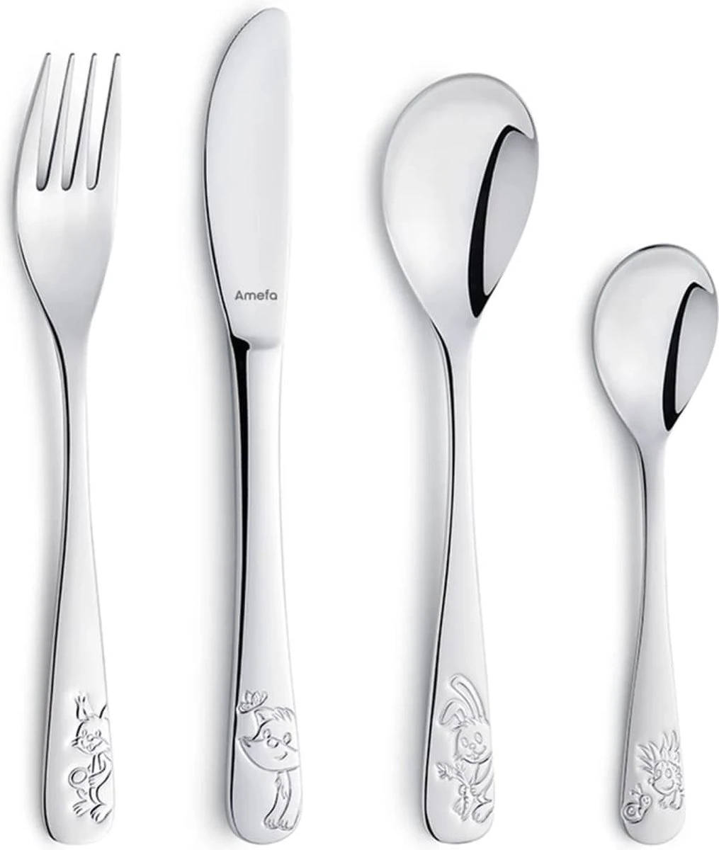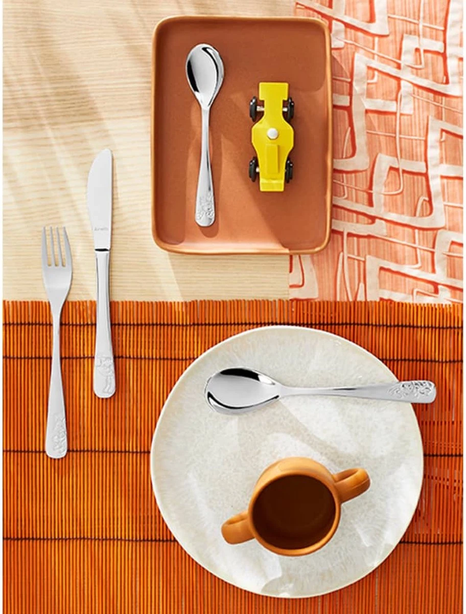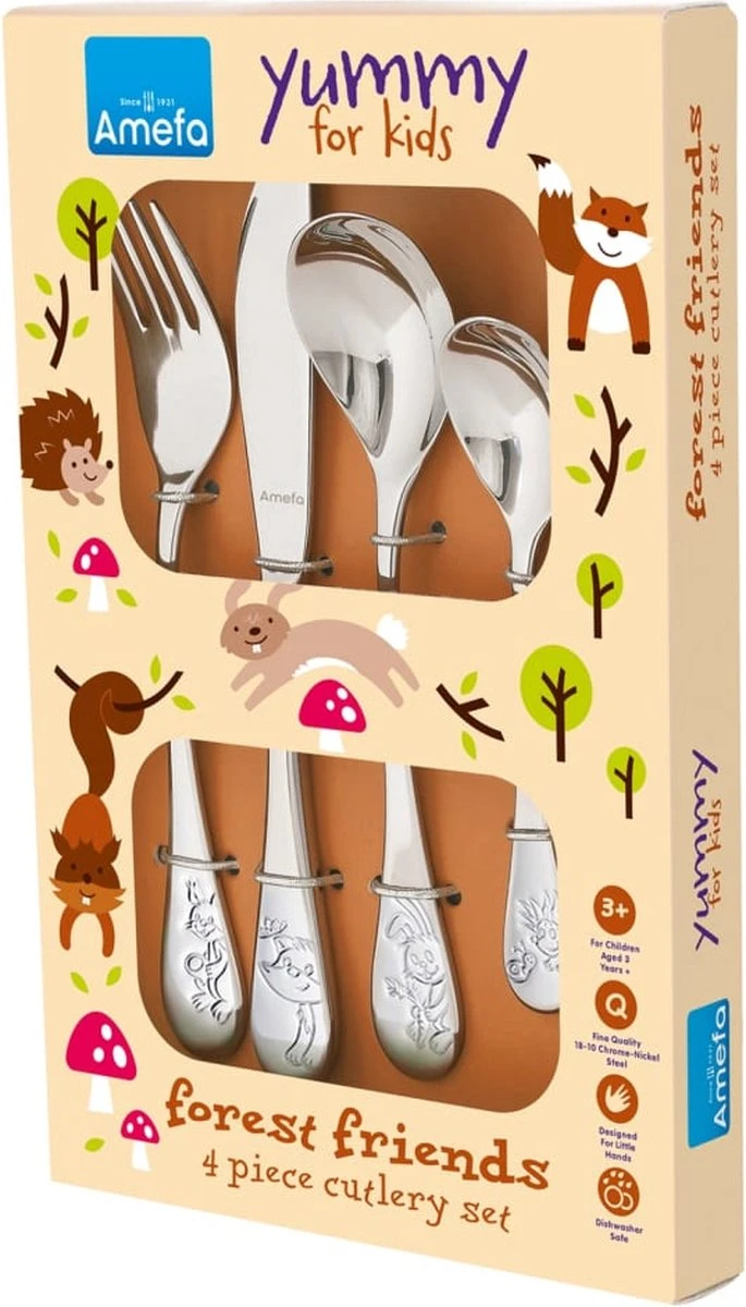Eten wordt een stuk leuker met dit vrolijke Amefa kinderbestek. Op de handvatten van dit bestek zijn de kleine vriendjes uit het bos afgebeeld. De vos, eekhoorn, konijn en egel lachen je toe terwijl je kindje zijn of haar maaltijd naar binnen werkt. Het bestekset bestaat uit chroomnikkelstaal 18/10. Hierdoor is het beter bestand tegen corrosie en gaat het dus langer mee. Het zilverkleurige bestek is afgewerkt met een luxe hoogglans. Kinderbestek is ideaal om je kindje zelf te leren eten. Het helpt mee met het ontwikkelingen van een goede hand- en oogcoördinatie. Dit leidt vervolgens tot een positieve bijdrage aan het zelfvertrouwen. Amefa Forest Friends bestek is dan ook speciaal gemaakt voor kleine handjes. Het is ontworpen op een manier zodat kinderen het makkelijk vast kunnen houden. De snijrand van het mes en de stelen van de vork zijn voor de veiligheid bot gemaakt. Het heft van de vork, lepel en mes zijn 2,5 mm dik. Het kinderbestekset zit verpakt in een kleurrijke geschenkdoos. En is dan ook erg leuk om te geven als verjaardagscadeau. Deze set is geschikt voor kinderen vanaf 3 jaar. Het bestaat uit de volgende onderdelen: – 1 Mes – 1 Vork – 1 Lepel – 1 Dessertlepel