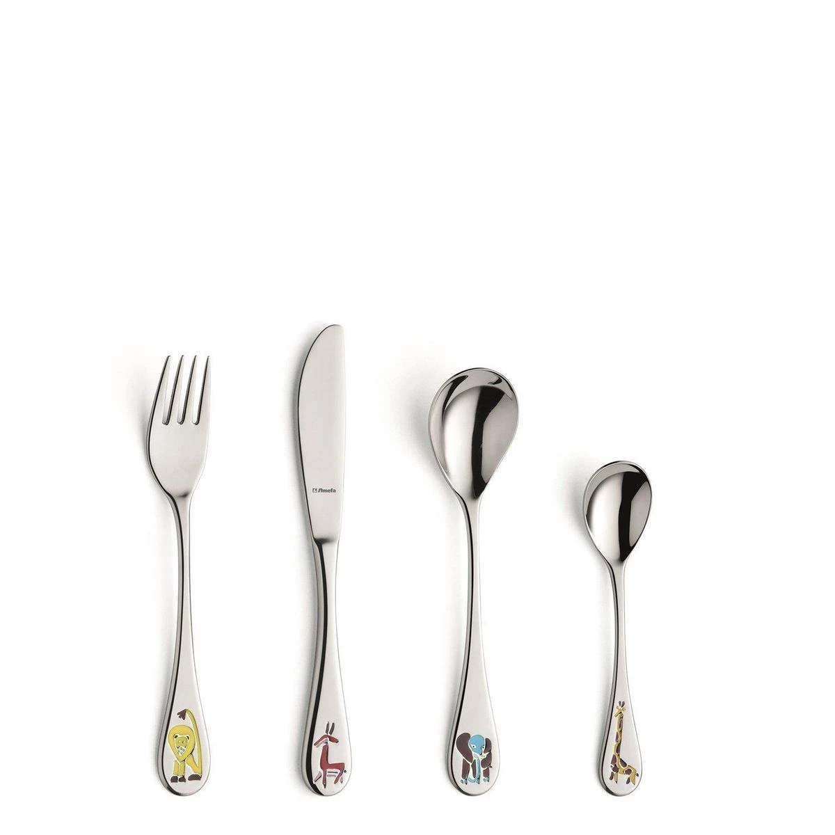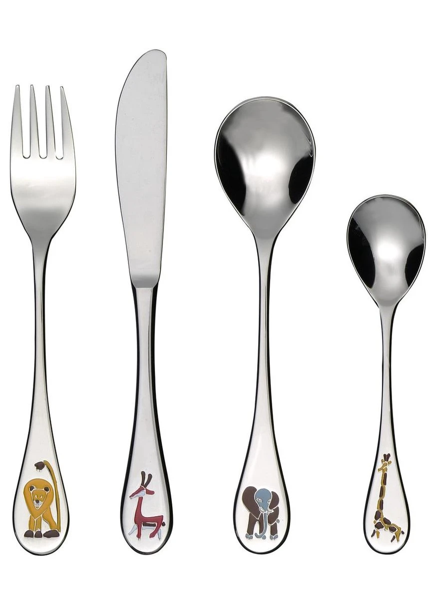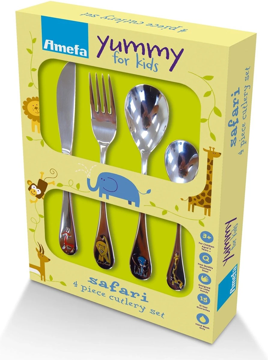 De 4-delige Amefa kinderbestekset ‘Safari’ is speciaal bedoeld voor jonge kinderen, die trots kunnen zijn op hun eigen bestek. De set bestaat uit:
