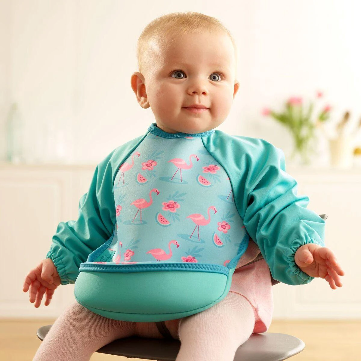 Een leuke mouwslab in helderblauw met vrolijke flamingo’s. Deze Bibetta mouwslab is geschikt voor kindjes van 6 tot 36 maanden. Het is gemaakt van neopreen, wetsuitmateriaal, waardoor het waterproof, supersterk en heel zacht is. Een comfortabele en praktische mouwslab dus die gewoon doet wat je ervan verwacht: de kleren van jouw kindje droog en schoon houden. En ook bij deze mouwslab kun je de onderkant omvouwen tot een handig opvangbakje.