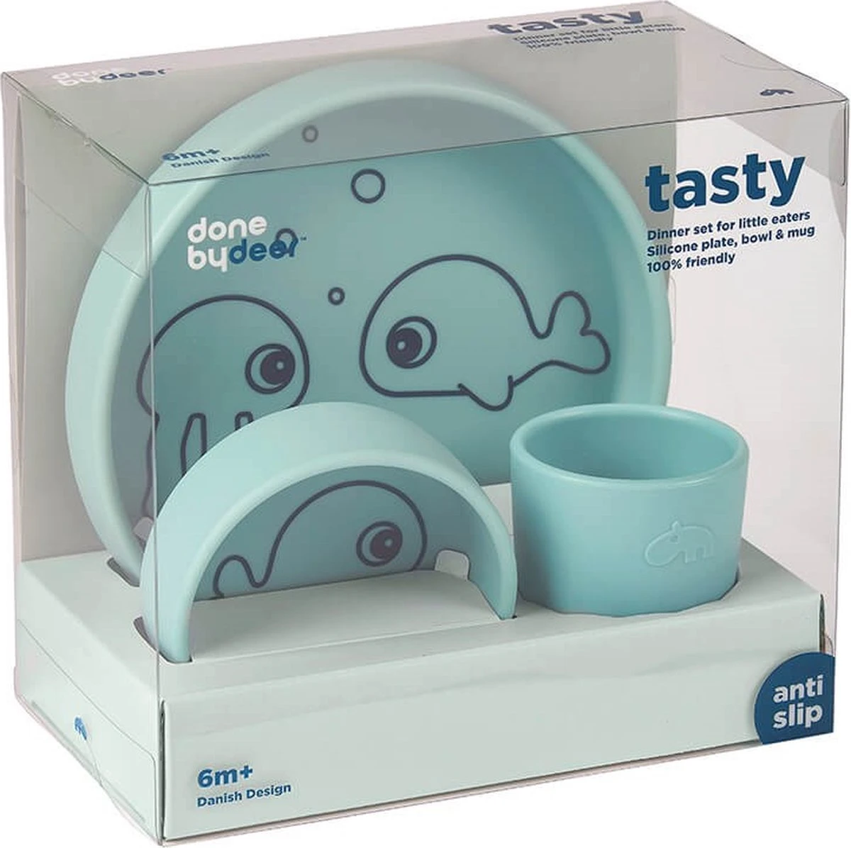 Met dit Done by Deer dinerset kan je kleintje zelfstandig eten en drinken. De set bestaat uit een bordje, een kommetje en een beker. Omdat het bord, kommetje en de beker voorzien zijn van antislip aan de onderkant blijfven deze stabiel en stevig op de tafel staan. De set is gemaakt van kwalitatief materiaal dat wel tegen een stootje kan. Eigenschappen, – Materiaal: silicone, – Antislip, – Inclusief: bordje, kommetje, en beker, – Afmetingen 21 x 17 x 2,5 cm