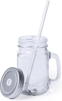 Merkloos 4x Stuks Glazen Mason Jar Drinkbekers – Zilvergrijze Dop En Rietje – 500 Ml