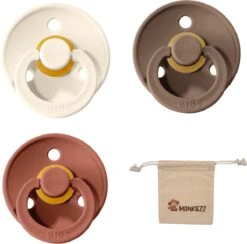 Bibs Fopspeen | Met Monkiezz Speenzakje – Maat 1 0-6 Maanden – 3 Stuks – Vanilla – Dark Oak – Ivory White