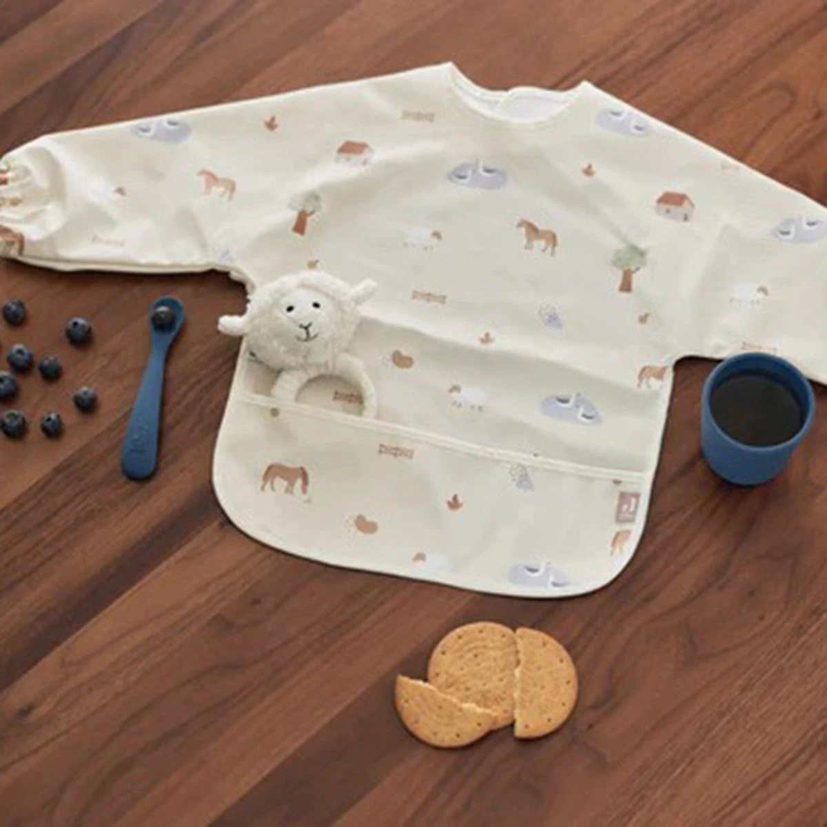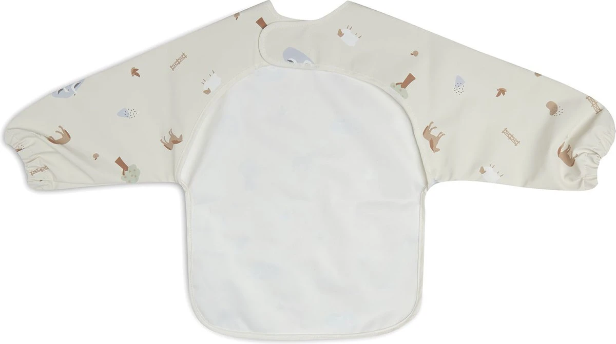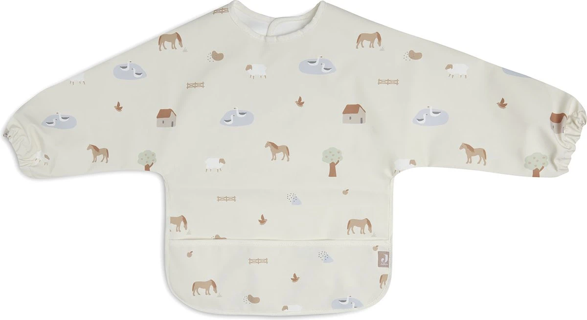 Deze slab met mouwen is geweldig. Het is een soort schortje en beschermt de kleertjes van jouw baby of dreumes extra goed door die mouwtjes.