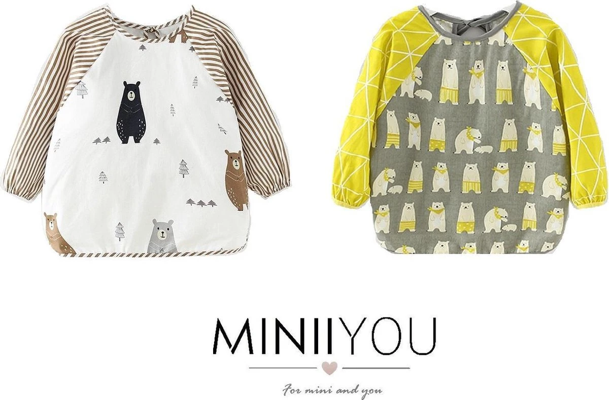 Deze leuke kunststof Slabber met lange mouwen beschermt de kleding van jouw MINII tegen nare etensvlekken en etensresten.
