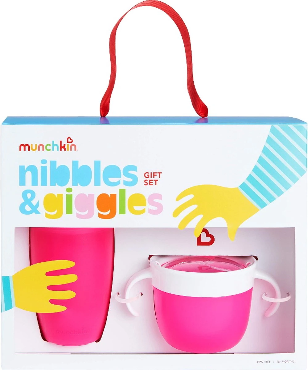 Minder kruimels en druppels met de Nibbles & Giggles Gift Set van Munchkin! De set bevat de roze Miracle 360º Sippy Cup en Snack Catcher.Erg leuk om iemand cadeau te geven of voor je eigen peuter!