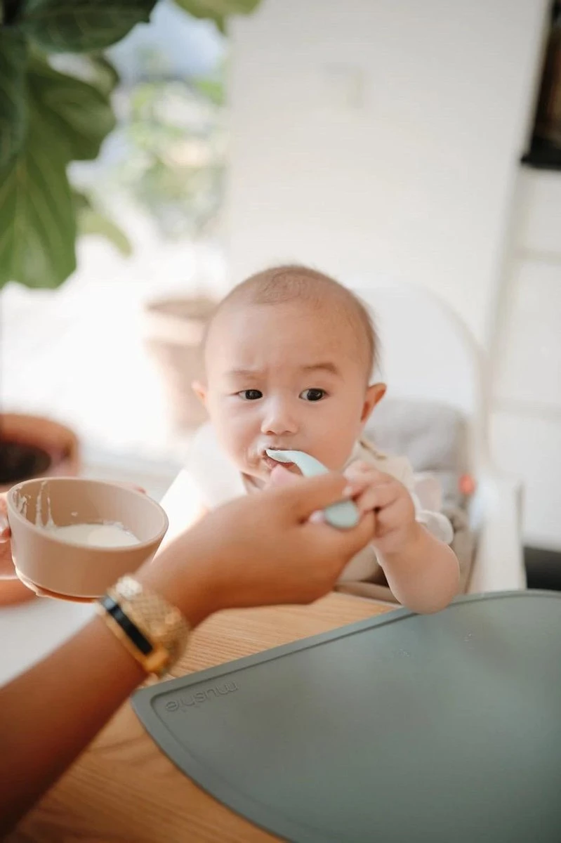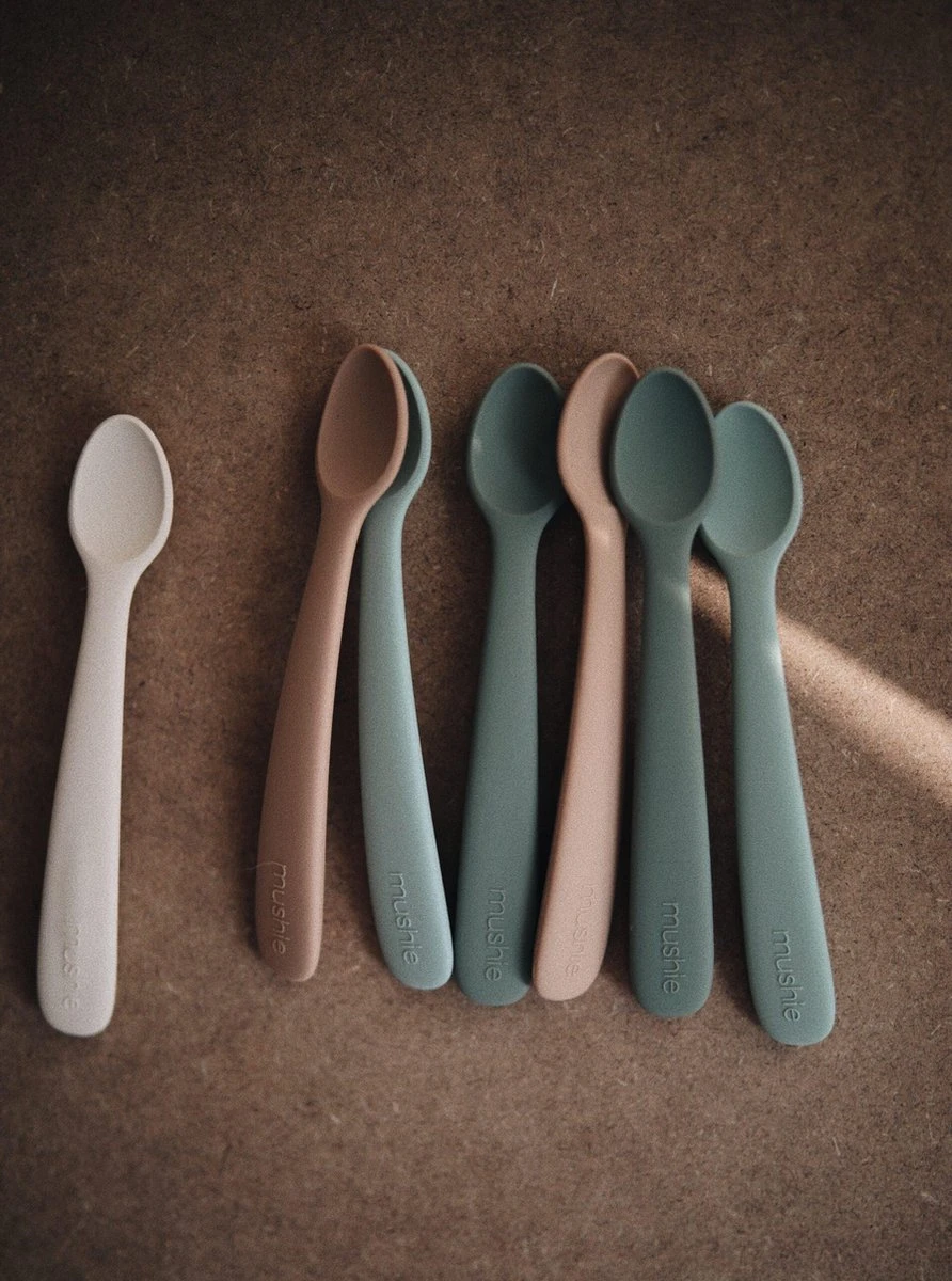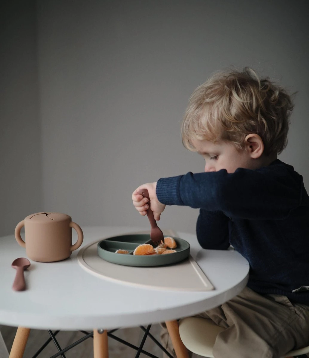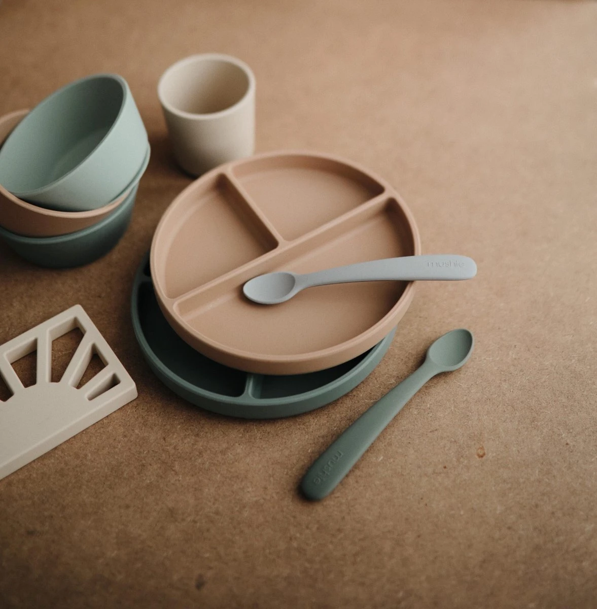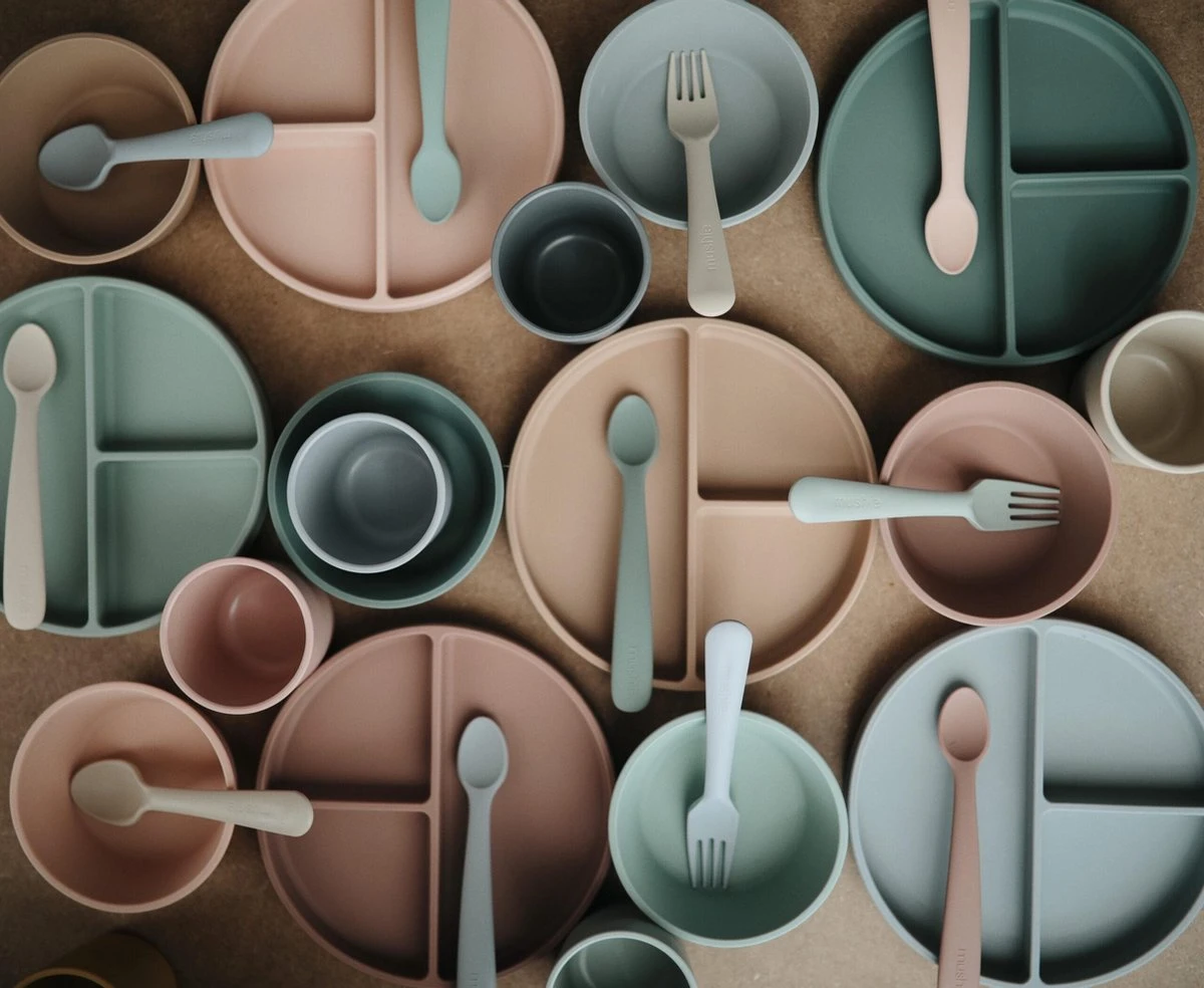 Het kinderservies van Mushie heeft een modern en eenvoudig design en is gemaakt van eco-vriendelijk materiaal.