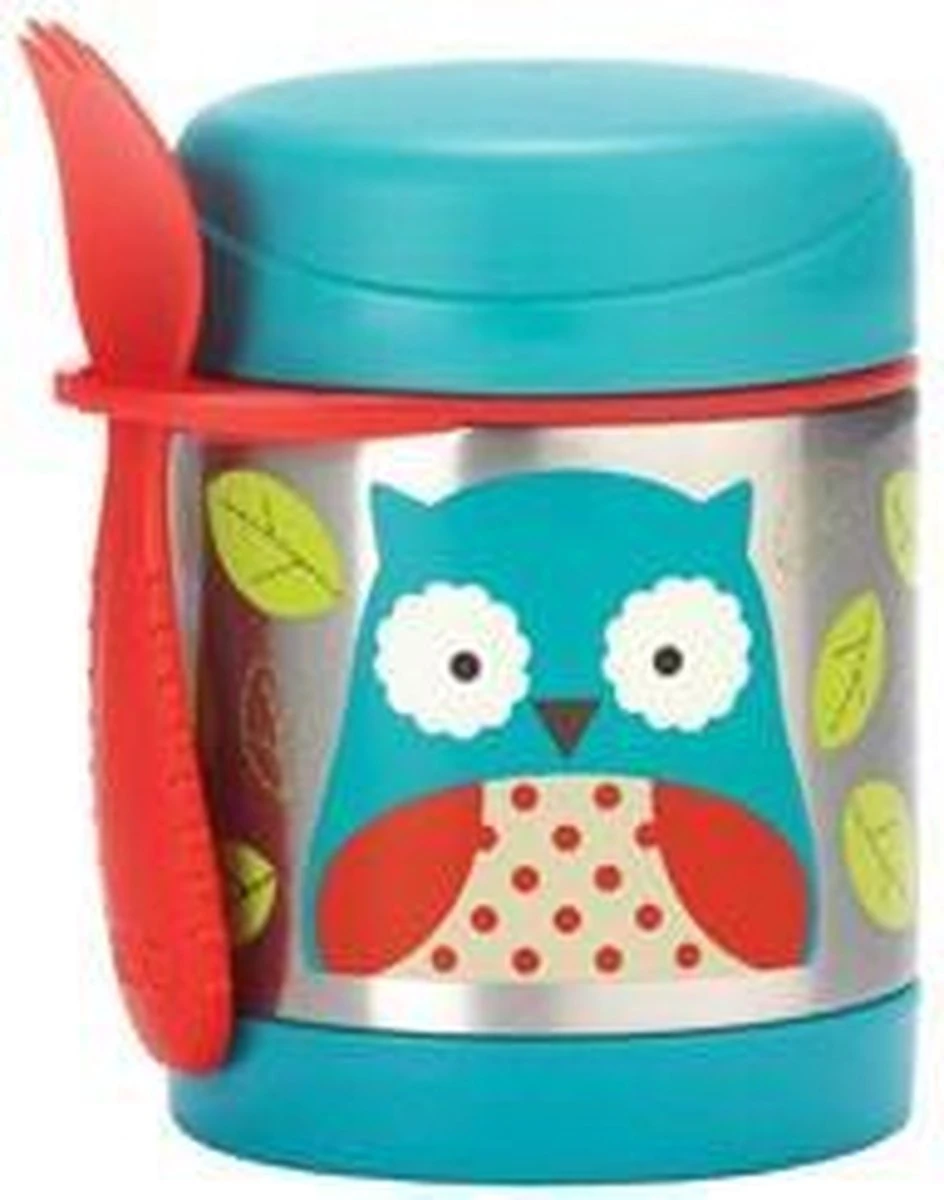 Leeftijden 12m + Roestvrij stalen behuizing zorgt ervoor dat spullen koud voor maximaal 5 uur, en items warm voor maximaal 7 uur Met Owl print Met houder voor spork Inclusief een spork (lepel + vork!) Houdt 325 ml BPA-vrij, PVC-vrij en ftalaat-vrij Maat (cm): 9.4lx 8.75wx 12h